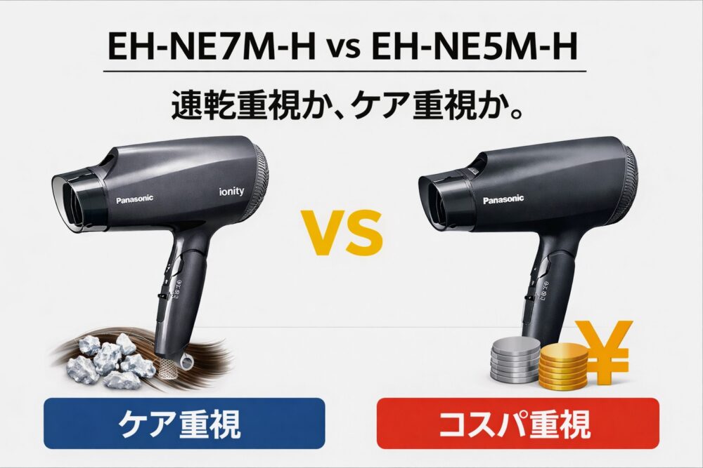 パナソニックの大風量ドライヤー「EH-NE7M-H」と「EH-NE5M-H」の違いを比較して、分かりやすく解説します。